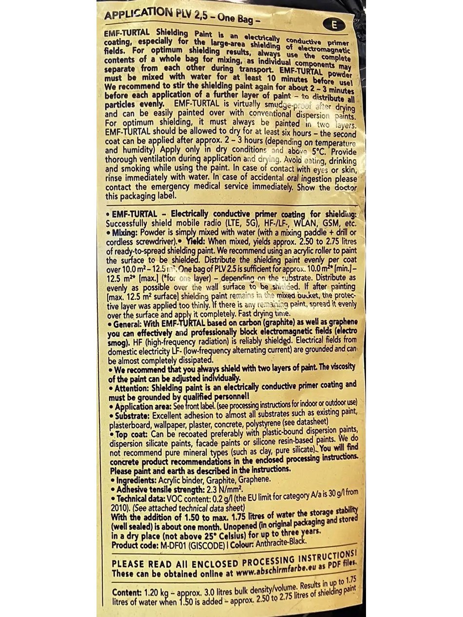 | Product Application and Yield | CAUTION: ALWAYS USE A FACE MASK, EYE PROTECTION, AND WORK IN A WELL-VENTILATED AREA WHEN USING POWDER OR LIQUID PAINT. EMF TURTAL Shielding Paint is an electrically conductive primer coating, especially for large area shielding of electromagnetic fields. For optimum shielding results, always use the complete contents of a whole bag for mixing, as individual components may separate from each other during transport. EMF-TURTAL powder must be mixed with water for at least 10 minutes before use! We recommend stirring the shielding paint again for about 2 to 3 minutes before each application of a further layer of paint to distribute all particles evenly. EMF-TURTAL is virtually smudge-proof after drying and can be easily painted over with conventional dispersion paints. For optimum shielding, it must always be painted in 2 layers. EMF-TURTAL should be allowed to dry for at least 6 hours –the second coat can be applied after approximately 2 to 3 hours (depending on temperature and humidity). Apply only in dry conditions and above 41°F (5°C). Provide thorough ventilation during application and drying. Avoid eating, drinking, and smoking while using the paint. In case of contact with eyes or skin, rinse immediately with water. In case of accidental oral ingestion please contact the emergency medical service immediately. Show the doctor the packaging label. NOTE – Depending on the thickness of the liquid paint, one bag of powdered paint mixed with 0.5 gallons (2 liters) of water yields approximately 0.66 to 0.73 gallons (2.5 to 2,75 liters) of ready-to-use shielding paint, enough to cover an area approximately 134.5 sq ft (12.5m²) with one layer. The amount of water added may vary depending on surface absorption. Add water slowly, mixing as you add until you reach a thick, fully blended consistency. Desired consistency will depend on the surface the paint is applied to. Remix paint occasionally to ensure heavier material is not settled to the bottom of the mixing vessel. EMF-TURTAL – Electrically conductive primer coating for shielding: Successfully shield mobile radio (LTE, 5G), HF-/LF-, WLAN, GSM, etc. With the addition of 1.50 to max. 1.75 liters of water the storage stability (well sealed) is about one month. Unopened (in original packaging and stored in a dry place (not above 25° Celsius) for up to three years. Product code: M-DF01 (GI5CODE), Color: Anthracite-Black. PLEASE READ ALL PROCESSING INSTRUCTIONS! Content: 2.65 lbs (1.20 kg) – yields approximately 0.66 to 0.73 gallons (2.50 to 2.75 liters) of shielding paint. |